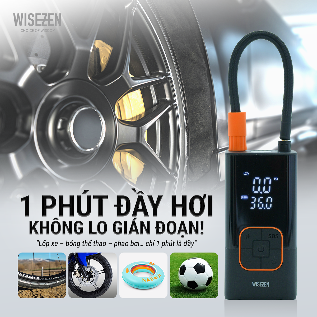 Bơm ô tô Wisezen AC01 lốp xe đạp máy oto điện bóng Không Dây mini thổi phồng nhanh Kiêm Sạc Dự Phòng Điện Thoại